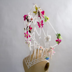 Hook and eye closure in front attached to elastic bands. Can also be left open. Worn like a vest. Each joint is sewn together for extra strength. Ivy can be removed and replaced with flowers, bells, anything with cool texture or left alone as the cool cage.